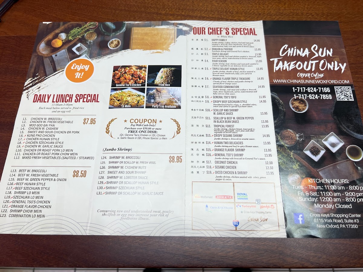 Located at 6115 York Rd #3 in New Oxford, PA, China Sun Restaurant is a gem for lovers of authentic Chinese cuisine. This establishment is renowned for its commitment to freshness, with dishes prepared using high-quality ingredients. Customers rave about the bright, crisp vegetables and firm shrimp that exemplify their exceptional culinary standards.